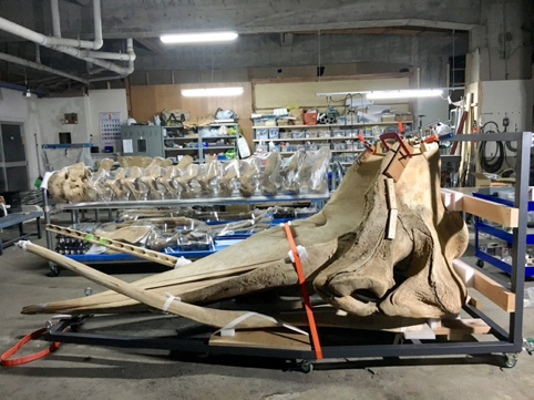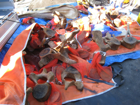 マッコウクジラの骨格標本製作例 オス体長 10.62m 体重 17000㎏ 解剖調査後埋設した全身骨格を発掘した状態:レノグリーン液に浸ける前の骨 晒工程後の洗浄 環椎(第二頚椎) 全身骨格標本完成 レノグリーンによる骨格標本製作